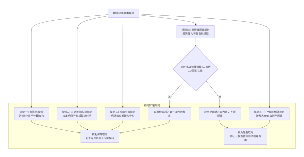 刑事诉讼法中期间计算的五大核心规则及其内在逻辑,特别突出了对权利保障与权力限制的双重考量