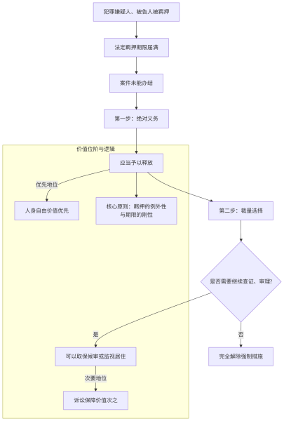 办案机关在羁押期限届满案件仍未办结时必须遵循的两步处理逻辑