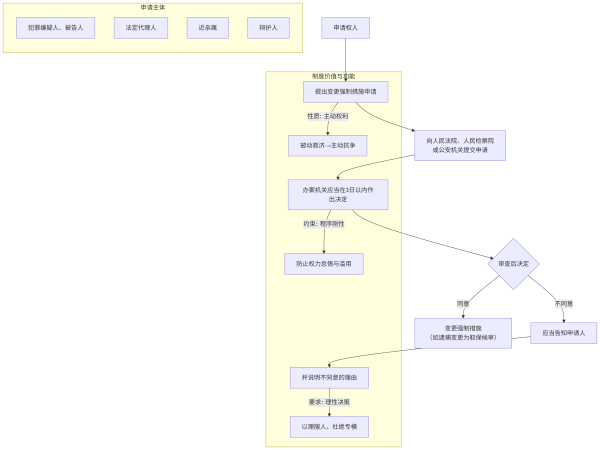 申请变更强制措施的全过程,明确了各方主体的权利、义务及程序走向