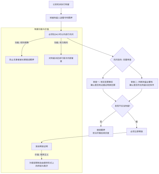 该流程图揭示了拘留后24小时内讯问制度的运行机制、核心功能及可能产生的两种法律后果。