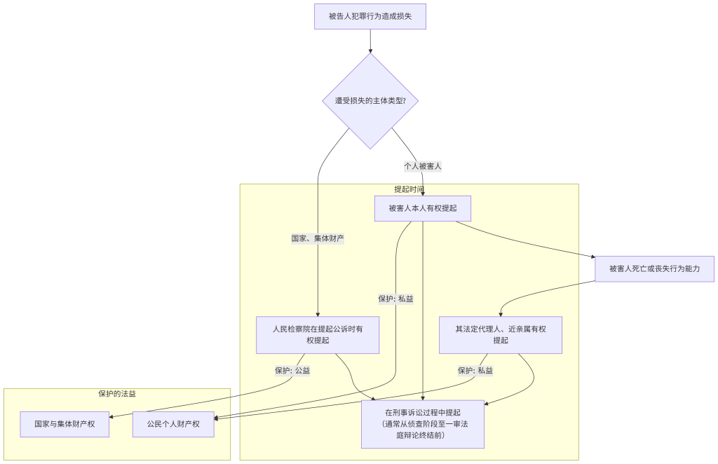 哪些主体有权在何时提起附带民事诉讼以及不同主体所代表的利益范围